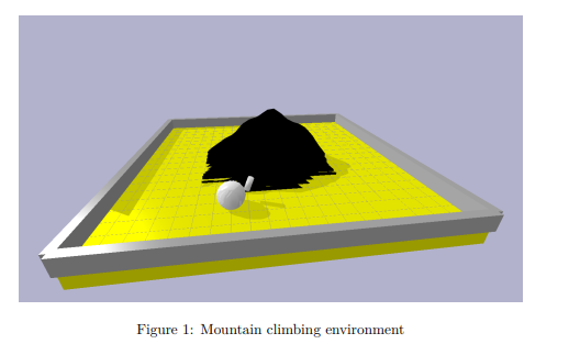 You can see that there is a kind of sandbox with a mountain in the middle. The idea is for the creature to get as high as possible up the mountain, without cheating and flying into the air. Your job is to integrate that new environment into the simulation code and to adapt the fitness function so it measures maximum closeness to the top of the mountain.